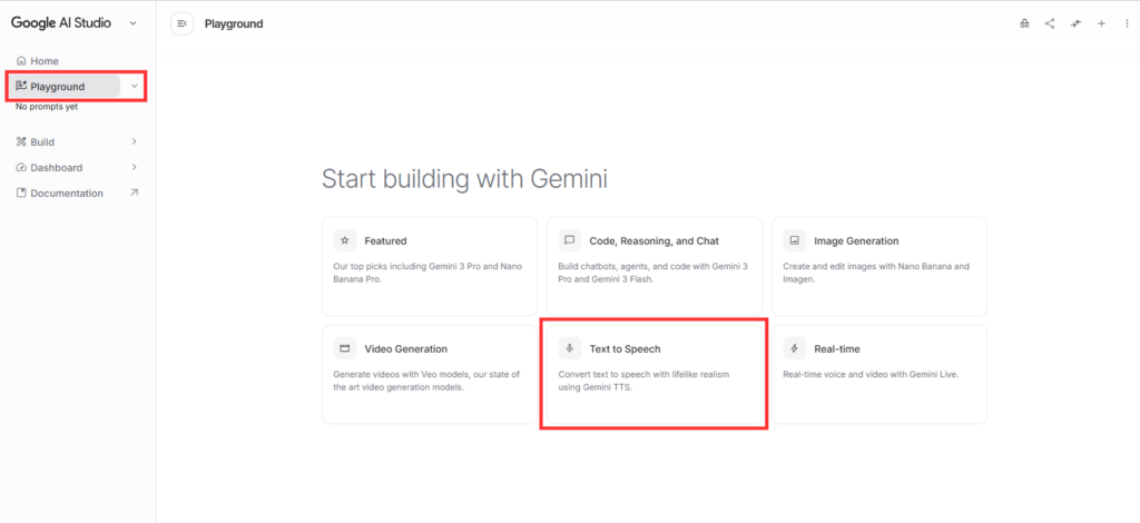Playgroundを開くと、上部に機能の選択メニューがあります。その中から Text to Speech を選択します。